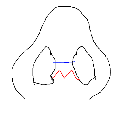 [@좋은선생님만나게해주세요] 10년넘은 너무옛날이라 원장님 바뀌셨을거야 ㅋㅋㅋ ㅠㅠ 요새는 코전문이라고 하면 대부분 저렇게 해주시는데 대형중에 임상필요한사람들 병원에서 매치시켜준 의사들이나 완전 올드한스타일 의사들중에 저렇게 파란선 위치에 째는경우 종종있어