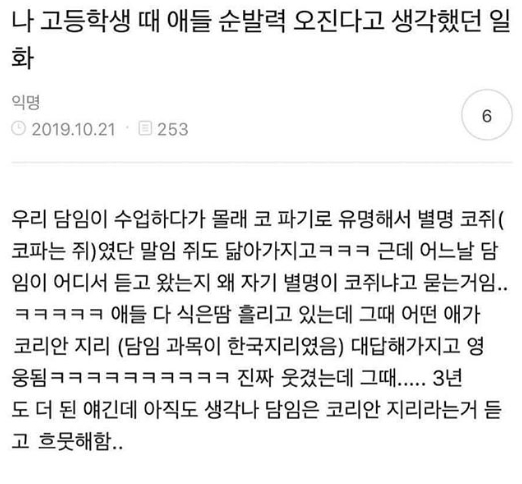 아직도 코쥐 들으면 흐뭇해한다는 담임쌤이 너무 웃기네욬ㅋㅋㅋㅋㅋㅋㅋㅋㅋㅋ