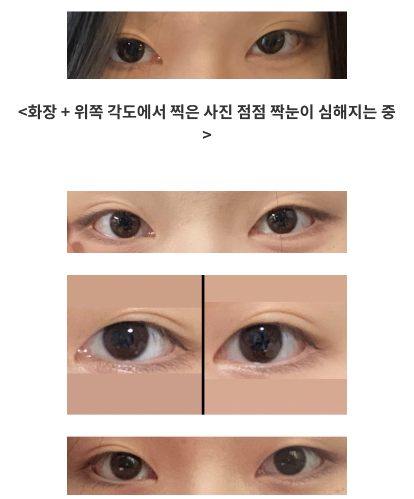 이게 내 눈 상태인데 보다시피 왼쪽은 아예 겹주름이 라인처럼 자리를 잡아버렸고 눈살이 없어서 오른쪽 눈도 이상하게 겹쌍이 생기는 중이야