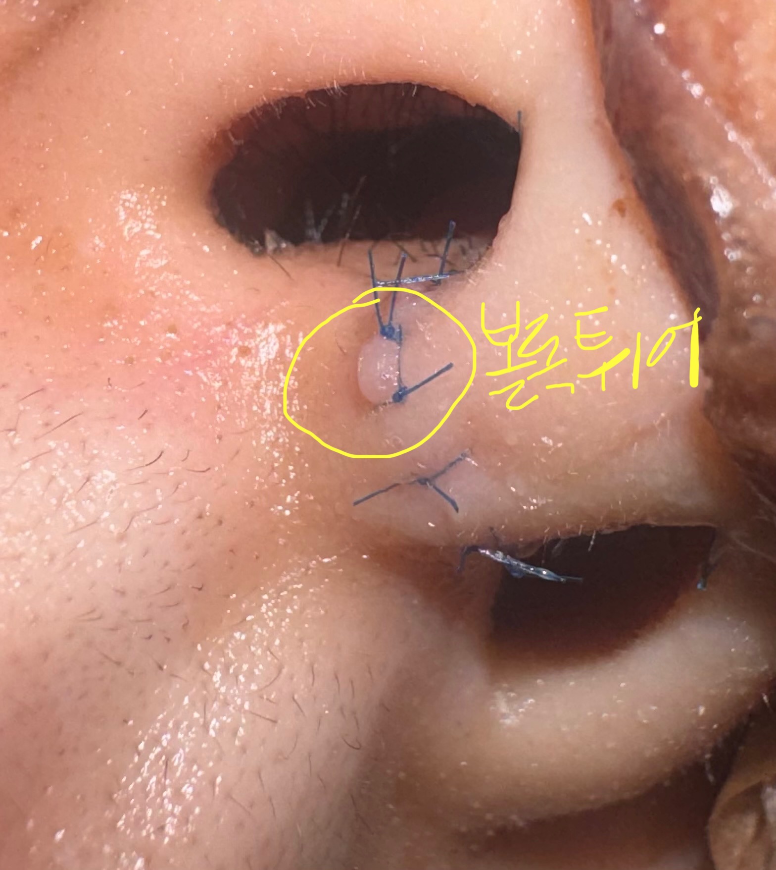 이거 걍 봐선 모르는데… 병원에 연락해보길. 아직 겉실밥도 뻡기전이라 실밥 뽑으며 체크할듯도. 나도 갑자기 콧속 비주 안쪽으로 뭐가 올라왔는데 물집처럼 안보여서 흉살이다 이러고 진료잡았다가 면봉으로 누르니 터지더라. 그래도 막 누르지마!!!!!!!!!!!!!!! 비주 바깥 쪽이라 터져서 흉지거나 하면 난리난다. 병원에 연락하고 진료받아.