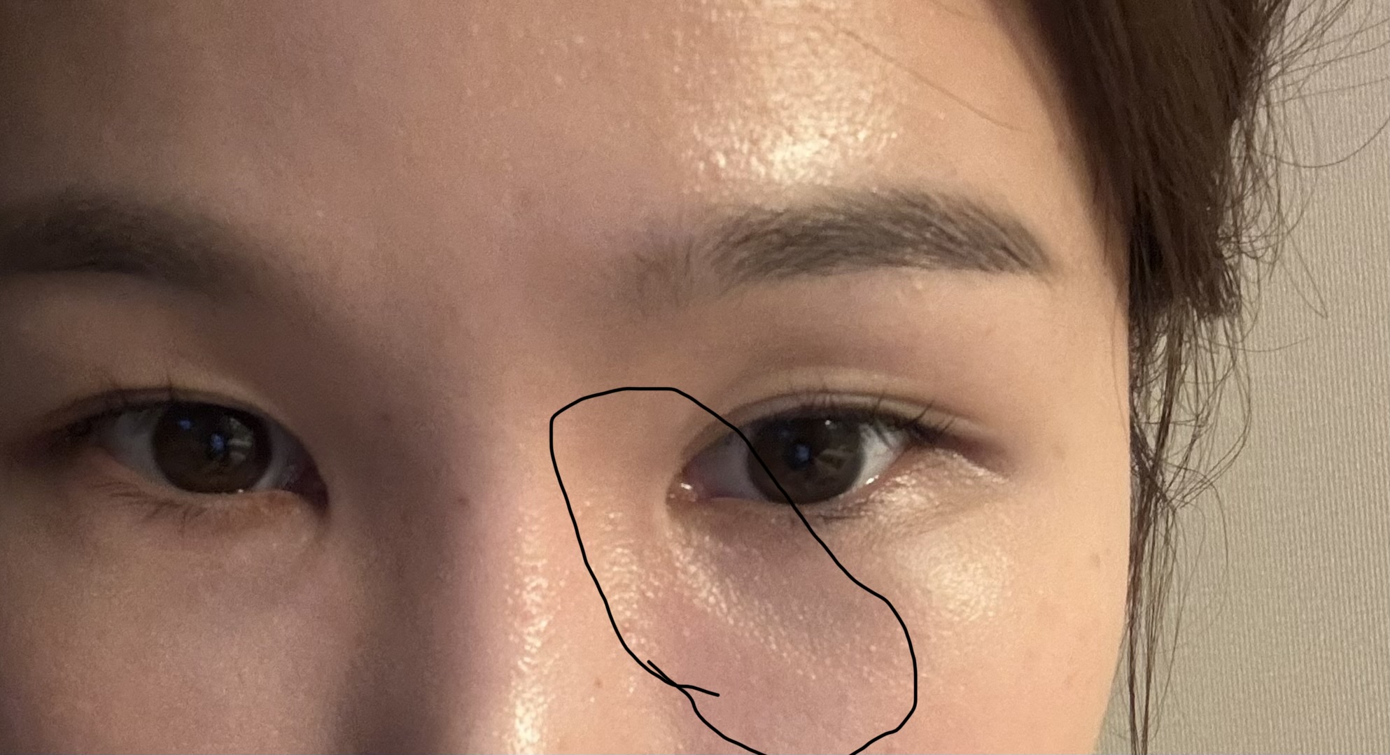 왼쪽 눈 앞머리부터 눈밑고랑 아래까지